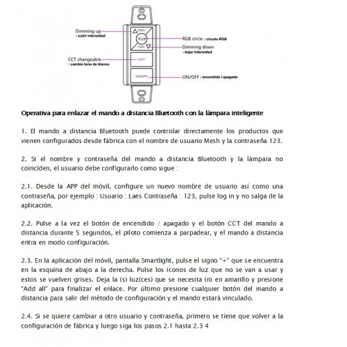 6. Tanto el mando a distancia así como el Smartphone pueden controlar el dispositivo inteligente Bluetooth con el nombre de usuario : Mesh y la contraseña : 123
