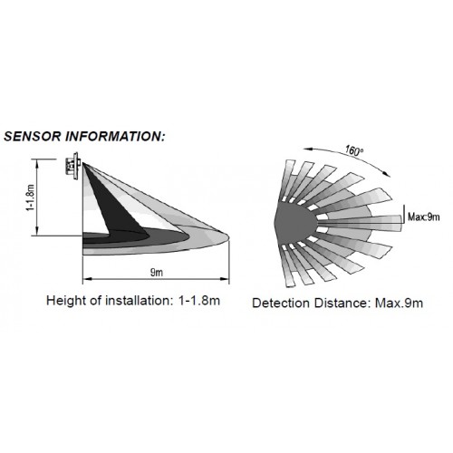 - ▶ Detector de movimiento por Infrarrojo con ángulo de detección de 180° y rango de detección de 9 m.