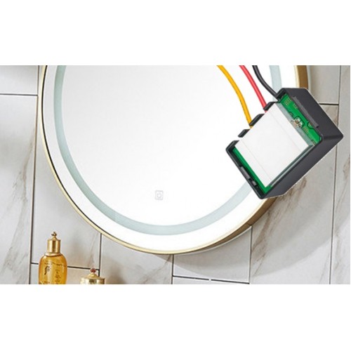 Interruptor táctil espejo DC 12V/24V hasta 72W ITETL para regular tira LED. Se coloca detrás de espejos y permite encender y apagar las luminarias conectadas. Tiene un indicador lumínico que permite encontrar fácilmente su posición Se puede colocar detrás de cristal, PVC, plástico, azulejo o cerámica. Se recomienda colocar como máximo en una superficie de 3 cm. de grosor, para que la detección se eficaz.