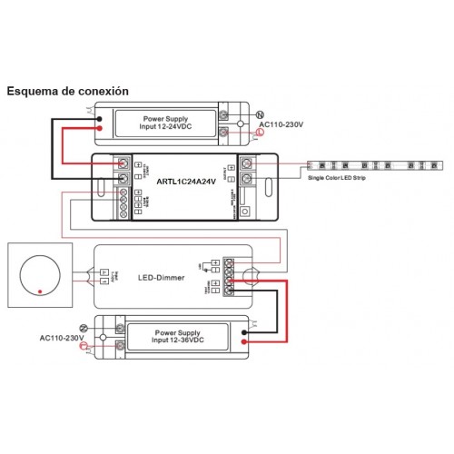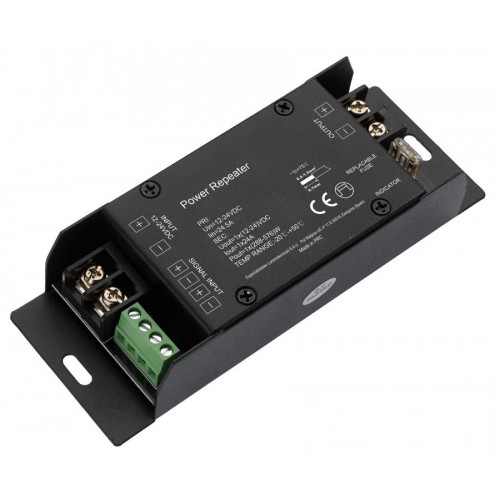 Amplificador Señal par Tira LED 1 canal 24A 12V-24VDC para voltaje constante para interior ARTL1C24A24V. Necesario para instalación de tiras LED que superen los 8 metros de longitud o donde la señal necesita más potencia.