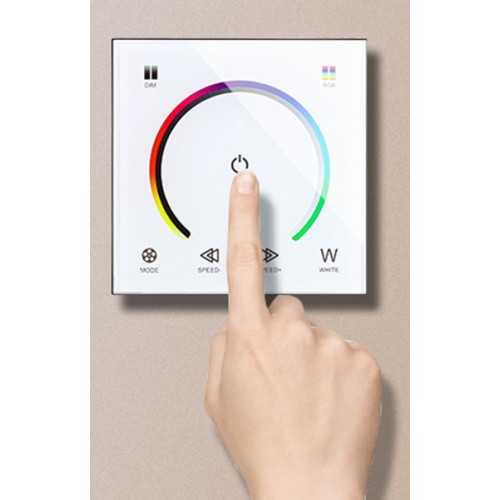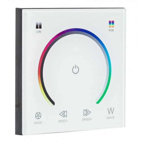 Controlador Táctil para tira LED RGB 12V 144W, 24V 288W Blanco para empotrar en cajetín universal CRGB288NBEMP. Controle el color de cualquier tipo de led RGB, sube y baja la intensidad de la luz, elije entre un color fijo o cambio de colores automático, fundido de colores, regular velocidad de cambio de colores, etc.