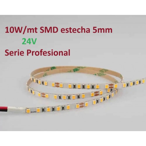 Tira LED Flexible 24V 10W/mt estrecha 5mm 168 Led/mt SMD 2835 IP20 Serie Profesional, venta por metros