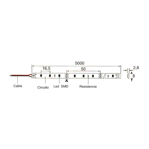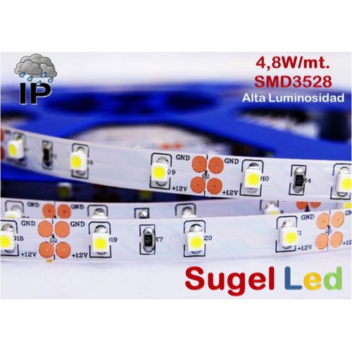Tira LED 5 mts Flexible 24W 300 Led SMD 3528 IP54 Blanco Cálido Alta Luminosidad TLF24WWIP65P 4,8W/mt 60 Led/m. Tira LED flexibles serie Professional son de máxima calidad (High Quality) y se presentan con configuraciones de distintas medidas y prestaciones. Su flexibilidad y la dotación de accesorios permiten su aplicación en multitud de diseños de iluminación decorativa de bajo consumo con un gran ahorro de energía. Las tiras de LED es autoadhesiva y presente diferentes grados de protección. A la hora de utilizar esta tira de LED, hay que tener en cuenta su intensidad lumínica, por lo que tendremos que poner un objeto cercano en el que proyecte la luz. Si su fin es como señalización, (delimitar pasillo, resaltar zonas de paso,…) no es necesario buscar un objeto donde proyectar la luz.
