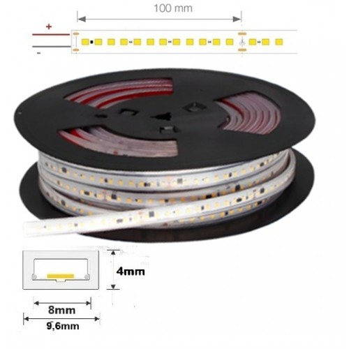 Tira LED 230V monocolor 14W/mt 120L/mt. SMD 2835 IP67 9,6x4mm corte cada 100mm, bobina de 50mts x 4,80€/mt