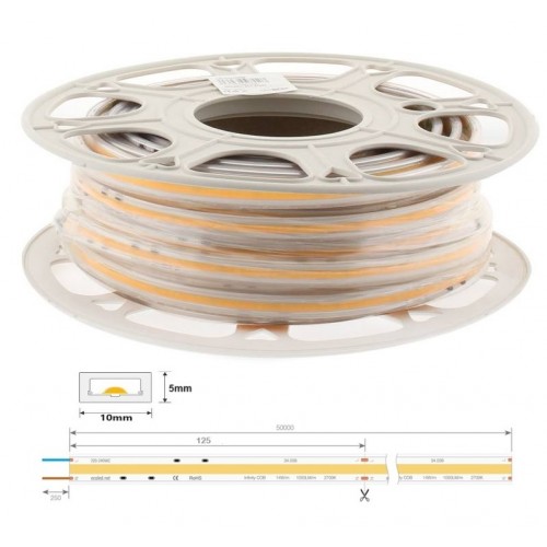 Tira LED 230V monocolor 14W/mt COB IP67 10x5mm corte cada 125mm, Bobina 20mts a 14,00€/mt