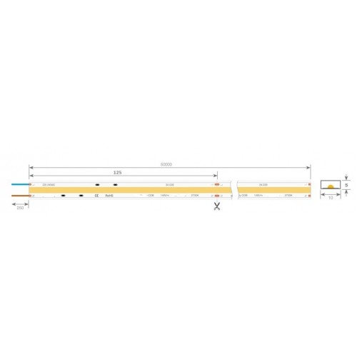Tira LED 230V monocolor 14W/mt COB IP67 10x5mm corte cada 125mm, Venta por metros. TLDCOB14B20. Tira LED monocolor que cuenta con protección IP67 y utiliza LEDs COB con 14W de consumo por metro. Este tipo de tira LED flexible de alta tensión se conecta directamente a la red eléctrica de 230V AC. Del mismo modo, para completar el montaje y la protección IP67, se deben incluir accesorios necesarios. A la hora de utilizar esta tira de LED, hay que tener en cuenta su intensidad lumínica, por lo que tendremos que poner un objeto cercano en el que proyecte la luz. Si su fin es como señalización, (delimitar pasillo, resaltar zonas de paso…) no es necesario buscar un objeto donde proyectar la luz. Ideal para iluminación de fachada, techos, residencias, teatros, zonas exteriores, vitrinas, luz comercial, escaparates. También son utilizadas para balizamiento de escaleras y pasillos.