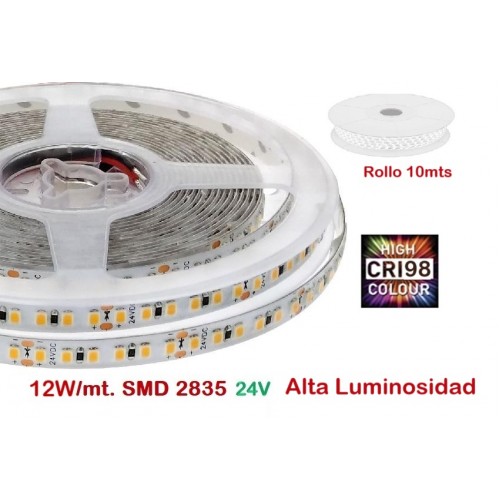 Tira LED Flexible 24V 12W/mt 140 Led/mt SMD 2835 IP20, Alta Luminosidad IRC-98, rollo 10mts TLF122835A24CRI98R10. Tira LED flexibles serie Professional son de máxima calidad (High Quality), con IRC >90 y se presentan con configuraciones de distintas medidas y prestaciones. Este tipo de tira de LED trabaja con fuente de alimentación de 24V en corriente continua. Su flexibilidad y la dotación de accesorios permiten su aplicación en multitud de diseños de iluminación decorativa de bajo consumo con un gran ahorro de energía. Las tiras de LED es autoadhesiva y presente diferentes grados de protección. A la hora de utilizar esta tira de LED, hay que tener en cuenta su intensidad lumínica, por lo que tendremos que poner un objeto cercano en el que proyecte la luz. Si su fin es como señalización, (delimitar pasillo, resaltar zonas de paso,…) no es necesario buscar un objeto donde proyectar la luz.